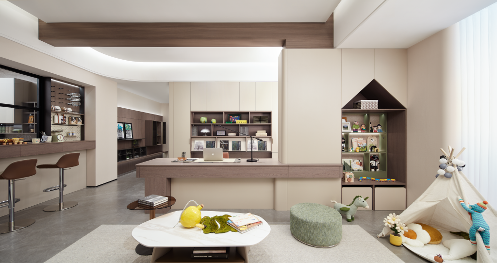 Bộ sưu tập “Joy Of Life” tập trung vào các giải pháp nội thất thông minh giúp không gian sống của gia đình có trẻ nhỏ luôn gọn gàng. Thiết kế tối ưu diện tích bằng tủ kịch trần, nội thất tích hợp đa năng và sử dụng các tông màu trung tính/pastel dịu mắt.